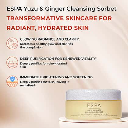 Indulge in the refreshing purity of ESPA Yuzu and Ginger Cleansing Sorbet, a transformative skincare treat that turns from a jelly-like texture to a nourishing oil and finally a foamy milk. This luxurious cleanser, enriched with zingy ginger, revitalising yuzu, and succulent mango, effortlessly dissolves makeup and impurities, infusing your skin with hydration and an unrivalled glow. Embrace the surge of natural vibrancy for super clean, quenched, and clarified skin that beams with a healthy radiance.