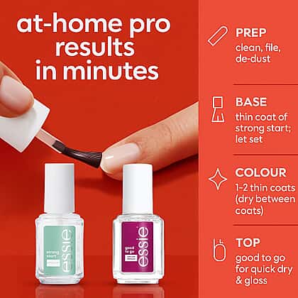 Essie nail care duo kit delivers effortless salon results from the comfort of your home. This curated set pairs the Strong Start base coat with the Good to Go top coat for a flawless manicure with enduring shine and protection. The base coat is enriched with biotin to strengthen and protect weak nails, laying a perfect foundation for colour. Once your favourite polish is applied, the top coat seals in colour and provides a high-gloss finish that dries quickly. With these two essentials, your nails look neat, luminous, and ready for any moment.