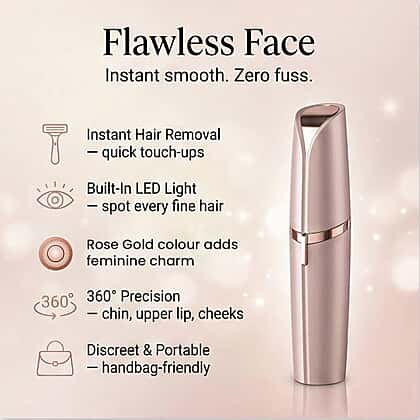 Achieve quick, precise facial hair removal with the finishing touch flawless face device in rose gold. Designed for gentle use, this compact tool helps remove unwanted facial hair without pulling or irritation, leaving skin feeling smooth and comfortable. The discreet design allows for easy handling and controlled movement across delicate areas such as the upper lip, chin, and cheeks. Simple to use and easy to carry, it fits effortlessly into a daily beauty routine or travel bag. Ideal for maintaining a neat, well-groomed look, it offers a practical solution for fuss-free facial hair removal at home.