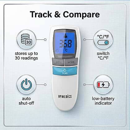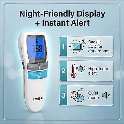 Keeping an eye on your family’s health feels easier with the HoMedics No Touch Infrared Thermometer with Digital Display, white delivers fast readings without any discomfort. Its infrared sensor measures in 1 second, so you simply point it at the forehead for an accurate result. The backlit LCD makes it easy to read in the dark, and the high-temperature alarm helps you spot problems quickly. It stores up to 30 readings and switches between Fahrenheit and Celsius when needed. The quiet mode is helpful at night, and the auto-shutdown feature preserves battery life for longer use.