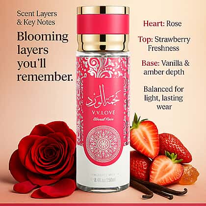 Embrace the romance of eternal rose fragrance mist, a perfect fragrance that captivates the heart and reflects femininity. The mist is a blend of strawberry notes with creamy vanilla and amber that lasts long throughout the day. This mesmerising mist instantly refreshes the senses and mood, leaving your skin feeling delighted with a touch of luxury. Ideal for everyday wear and special gifting to your loved ones.