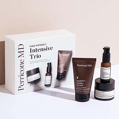 Transform your skincare routine with the MD Perricone high potency intense trio set. This exclusive set includes the Hyaluronic Intensive Moisturizer (30ml), Nutritive Cleanser (59ml), and Firming & Lifting Serum (15ml). Each product is expertly formulated to target specific skincare concerns, providing deep hydration, gentle cleansing, and noticeable firming. The hyaluronic moisturizer offers intense hydration, plumping the skin for a youthful appearance. The nutritive cleanser gently removes impurities, leaving your skin feeling refreshed and clean. The firming serum works to lift and firm, giving your skin a more sculpted look. Encased in a sleek design, this trio is perfect for achieving a radiant and youthful complexion.