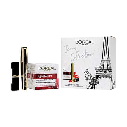 • It includes a Revitalift day cream, black mascara, and red lipstick