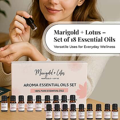 Immerse yourself in a world of natural tranquillity with the Marigold and Lotus Set of 18 Premium Aroma Essential Oils. Each 10ml amber glass bottle preserves the purity and potency of oils like lavender, sandalwood, tea tree, lotus and more. Designed with a secure black cap and built-in dropper, it allows precise application for aromatherapy, massage, or DIY beauty rituals. Whether you're unwinding with a diffuser or crafting bespoke candles, this collection caters to every wellness moment. Housed in protective UV-resistant packaging, it also makes a thoughtful gift for those who cherish holistic living and calming scents inspired by nature’s finest botanicals.
