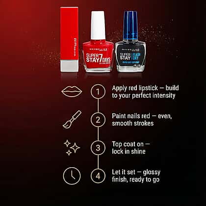 Turn up the confidence with this bold red lip-and-nail duo from Maybelline.This makeup set is your new glam essential for instant impact. The set includes a rich, high-pigment red lipstick that glides on smoothly, delivering a creamy, full-coverage finish that lasts. Paired with the iconic Super Stay 7 Days gel nail color, you get vibrant red nails with a glossy, salon-worthy shine. The quick-dry top coat seals everything in, keeping your manicure fresh and chip-resistant for days. Together, the duo creates a polished, powerful look made for nights out, busy days, and every moment you want to feel unstoppable.