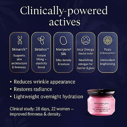 Onshindo Osaka Anti-Ageing Light Force Face Night Cream (Normal-Combination) is a rejuvenating formula that works while you sleep to restore vitality and radiance. Infused with vitamin E, yuzu, and inca omega oil, it deeply nourishes while helping skin release daily stress and toxins. Advanced actives such as Skinarch™, Sirtalice, and Moripure Silk boost firmness, elasticity, and density, visibly reducing wrinkles over time. With shea butter for hydration and allantoin for soothing care, the lightweight texture absorbs quickly without heaviness. Wake up to skin that feels refreshed, supple, and beautifully renewed, making this night cream an essential part of your routine.