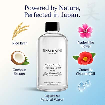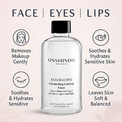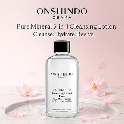Onshindo Osaka Pure Mineral 3-in-1 Cleansing Lotion for Face, Eyes and Lips (250ml) is a luxurious all-in-one formula designed to cleanse, nourish, and hydrate every skin type. Enriched with Nadeshiko extract to brighten and purify, rice bran to gently exfoliate, and natural Tsubaki oil to deeply hydrate, it works in harmony with coconut oil to support collagen production and improve skin resilience. This lightweight lotion effortlessly removes makeup and impurities while refreshing and toning the skin. Packed with Glycoin®, Prebiulin FOS, Resplanta-Babassú, and Fucogel, it leaves your complexion feeling smooth, supple, and perfectly balanced, ready to glow with renewed vitality.