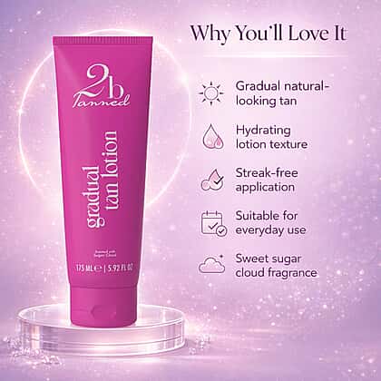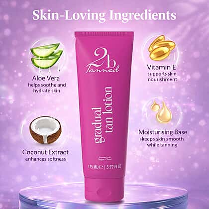 Enjoy a beautifully natural glow with the 2bTanned Gradual Tanning Lotion, created to build colour gently while caring for your skin. This lightweight, ultra-hydrating formula allows you to develop a subtle warmth or deeper bronze over time, giving you full control of your glow. Enriched with tropical fruit extracts including papaya, pineapple and mango, it helps revitalise and condition the skin while DHA gradually enhances colour. Glycerin and vitamin E deliver lasting hydration, leaving skin soft and smooth. With its silky texture and uplifting fragrance, this daily lotion transforms your routine into a moment of indulgent self-care.
