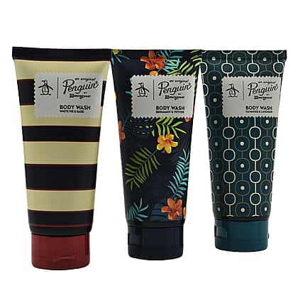 - Penguin Bumper Set including three body washes in Black Fig & Bourbon, White Fir & Sage & Oakmoss & Lavender