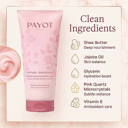 PAYOT Rituel Douceur Nourishing Body Cream in Wild Rose is a luxurious daily treatment crafted to comfort and replenish dry, tired skin. With a blend of 97% natural ingredients and infused with quartz microcrystals, this light yet richly textured cream melts into the skin, leaving it silky-soft and visibly nourished. The velvety formula wraps your body in a subtle floral scent with musky and powdery undertones, making each use a calming sensory experience. Ideal for post-shower hydration or after exfoliation, it’s designed to smooth, soften, and enhance your skin’s natural glow with a touch of everyday indulgence.