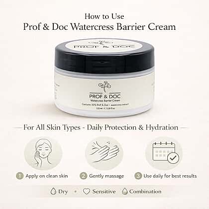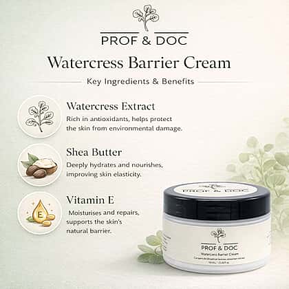 The Prof & Doc Watercress Barrier Cream is a rich, nourishing cream that provides lasting hydration and protection for the skin. Infused with 10% Prof & Doc watercress extract, it forms a protective barrier that locks in moisture and shields the skin from external elements. The cream absorbs quickly, leaving the skin soft, smooth, and revitalised without feeling greasy. Perfect for daily use, it helps prevent dryness, irritation, and environmental damage. This cream is ideal for anyone looking to maintain healthy, well-hydrated skin while protecting it from harsh conditions throughout the day.