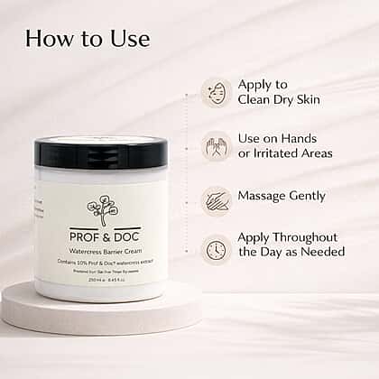 The Prof & Doc Watercress Barrier Cream is a rich, nourishing cream that provides lasting hydration and protection for the skin. Infused with 10% Prof & Doc watercress extract, it forms a protective barrier that locks in moisture and shields the skin from external elements. The cream absorbs quickly, leaving the skin soft, smooth, and revitalised without feeling greasy. Perfect for daily use, it helps prevent dryness, irritation, and environmental damage. This cream is ideal for anyone looking to maintain healthy, well-hydrated skin while protecting it from harsh conditions throughout the day.