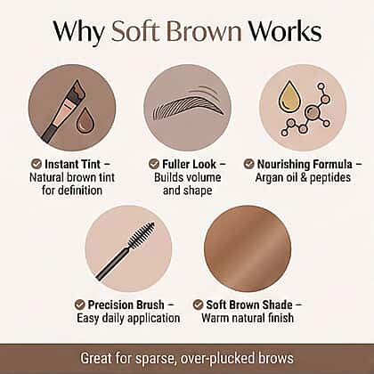 - Helps add volume, tint, and shape the brows.