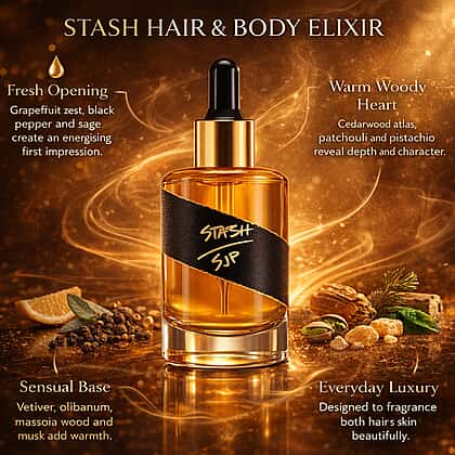 For women who appreciate a fragrance with depth and character, this Sarah Jessica Parker: STASH 30ml Hair and Elixir Oil offers a distinctive woody, earthy scent that lingers beautifully throughout the day. This versatile perfume oil lightly scents both hair and skin, creating a subtle yet confident aura. Bright grapefruit, black pepper, and sage open the fragrance, leading into a rich heart of patchouli, Atlas cedar, white ginger lily, and pistachio. A warm base of olibanum, massoia wood, vetiver and musk delivers lasting intensity. Simply shake well, hold 16 cm from the body and spray to enjoy a strong daytime fragrance that feels personal and memorable.