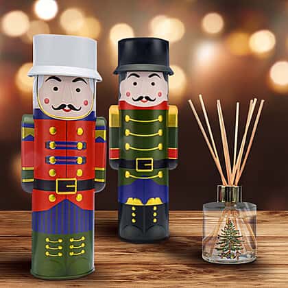 - It features a Nutcracker soldier gift tin a glass reed diffuser with gold cap.