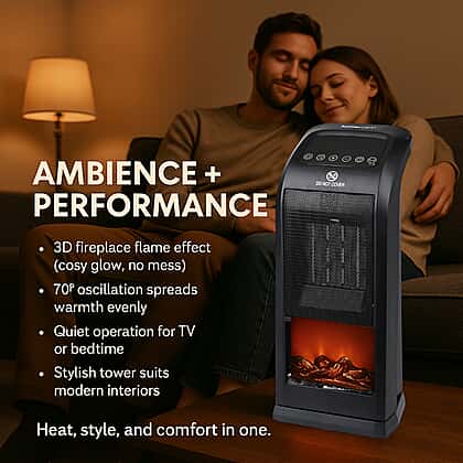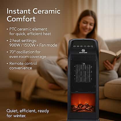 The Homesmart Ceramic Heater with remote control offers efficient warmth and stylish functionality for any room. Designed with a powerful PTC heating element, it provides two heat settings—900W and 1500W—plus a fan mode for versatile year-round use. The adjustable thermostat and 70° oscillation ensure even heat distribution, while safety features like overheating protection and a tip-over switch provide peace of mind. The heater also includes a cosy 3D fireplace flame effect, adding ambience to your space. Compact yet powerful, it weighs 1800g and features a durable V2-grade flame-retardant shell, making it perfect for regular use.
