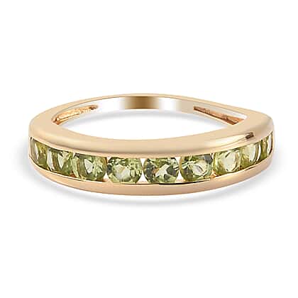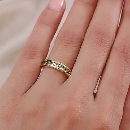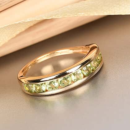 • STONE DETAILS: Lush green round cut and faceted nine Hebei Peridot are decked in a channel setting neatly one after the other at the front of the ring forming the half eternity pattern
