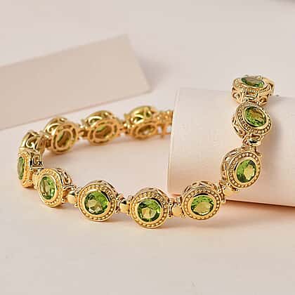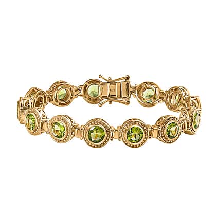 Lavish your wrist with the extraordinary glow of this Hebei peridot fancy bracelet, thoughtfully crafted to capture attention. This 7-inch bracelet features the charm of vivid green peridot rounds, meticulously set in the timeless grace of sterling silver. The touch of 18K vermeil yellow gold adds to its opulence, creating an enchanting golden charm. Enhanced with milgrain metal artwork, this bracelet exudes an air of sophistication and elegance that effortlessly elevates any outfit. Whether it's a special occasion or an everyday indulgence, this Hebei Peridot Bracelet makes a captivating statement.