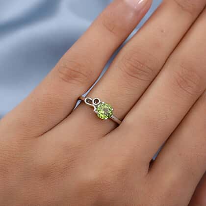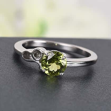 • A lone round-cut Chinese peridot weighing 0.75 carat embellishes the ring