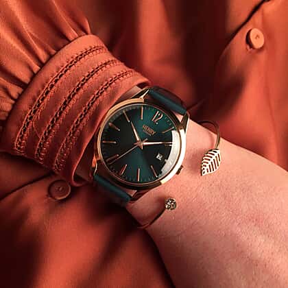 Henry London's shore ditch 34mm crystal women's wristwatch includes a green dial. A double domed glass lens completes the rose gold watch casing. The watch strap is made of green leather. This Shoreditch model has the traditional hour, minute, and second hands.