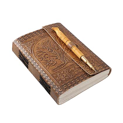 100% Genuine Leather and 100 % Cottton Handmade Paper Handcrafted Tree Embossed Journal with Wooden Pen (Size 17.8x12.7 Cm)- Brown