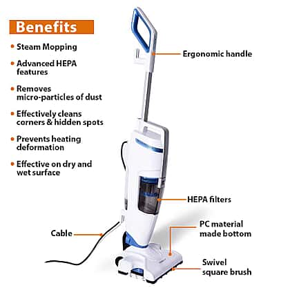 2-in-1 Steam and Vacuum Cleaner with Advanced HEPA Filtration, Mop and Cable Length 8 Metres