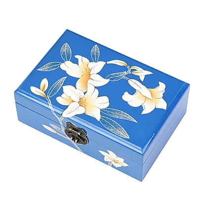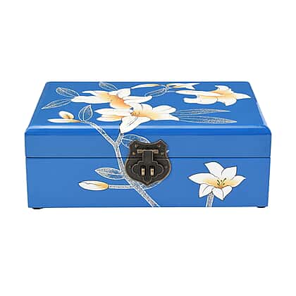 2 Layer Lily Pattern Jewellery Box with Inside Mirror and Removable Tray Jewellery Storage Organiser for Necklace, Earrings, Bracelets, Rings, and Accessories for Women's and Girls - Blue