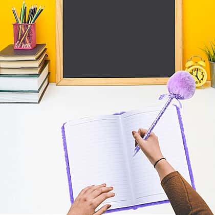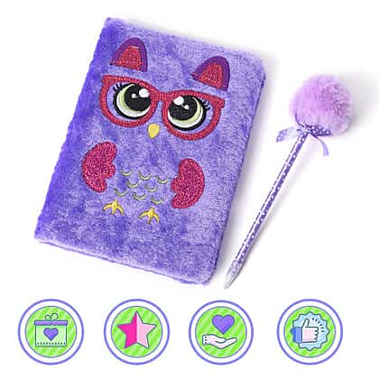 2 Piece Set - Fluffy Owl Cover Notebook with Pom-Pom Blue Ink Pen - Purple and Rose Red