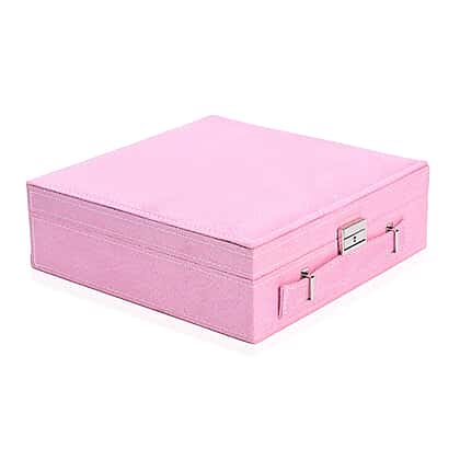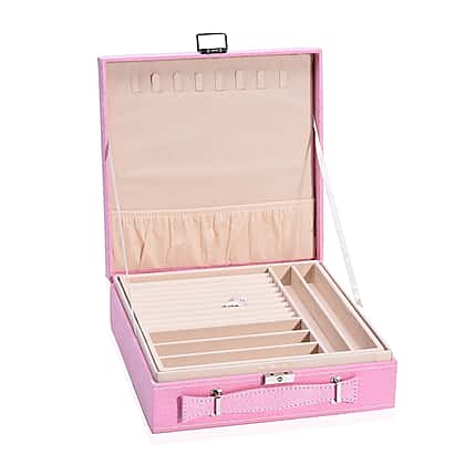2 Tier Jewellery Box with Handle, 8 Necklace Hooks, Removable Tray, 9 Sections and Multi Storages with Lock and Key Anti Tarnish Lining (Size 26x26x9 Cm) - Pink and Cream Colour