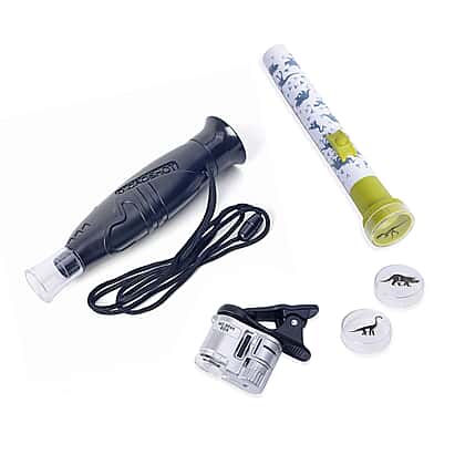 3 Piece Set for Children- Microscope, 60X LED Microscope and Flashlight with 3 Dinosaur Patterns