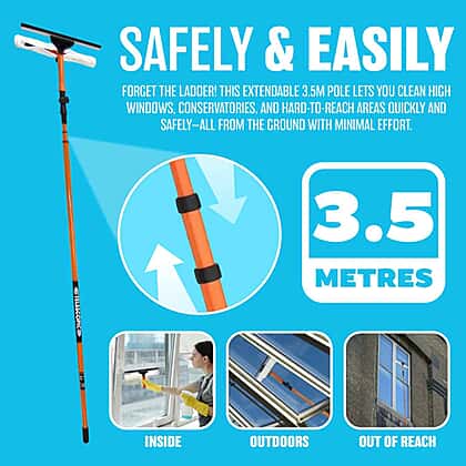 Achieve a streak-free shine on your windows with the 3.5m Telescopic Window Cleaner Squeegee. Designed for hard-to-reach places, this durable window cleaning tool features a strong, lightweight aluminium handle that extends up to 3.5 meters (11 feet), allowing you to clean high windows, conservatories, and more with ease.