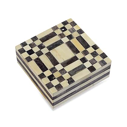 Chequered Pattern Handmade Bone and MDF Storage Box with Inside Velvet Lining (Size 15.5x15.5x6 Cm) - Black and White