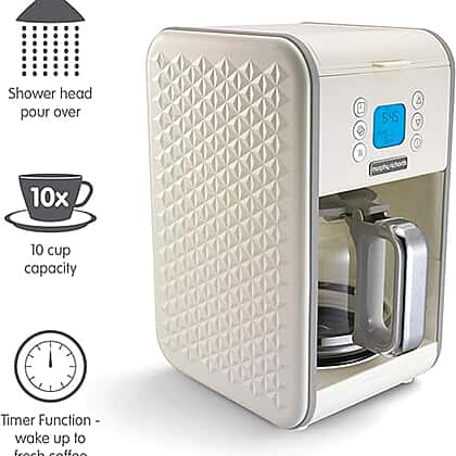 Discover the ultimate coffee experience with the Morphy Richards vector cream pour-over filter coffee machine. This innovative appliance features a pour-over shower head that ensures your coffee grounds are fully saturated, extracting maximum flavour every time. With a programmable timer, wake up to the aroma of freshly brewed coffee. The unique cupcake filter promotes even coffee coverage, while the auto shut-off feature and keep warm function add convenience. Enjoy up to 12 cups of delicious coffee, tailored to your taste with the coffee strength selector, all housed in a sleek patterned plastic design.