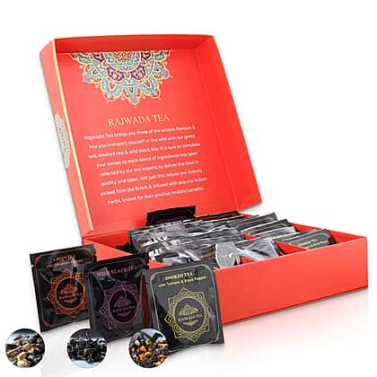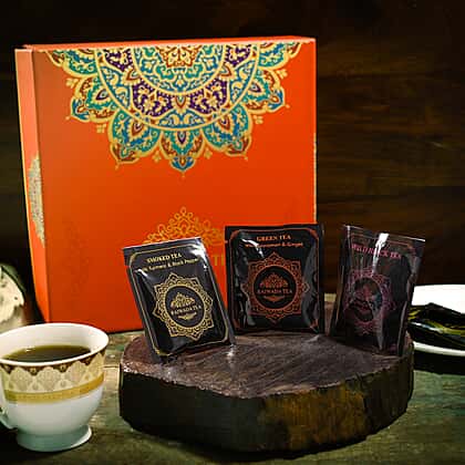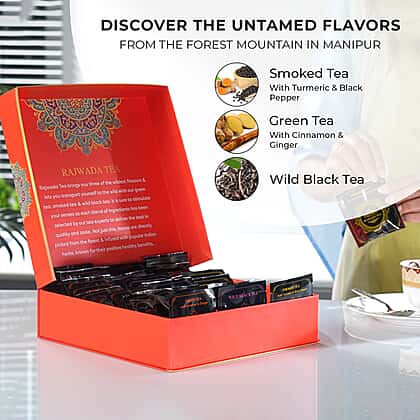 Hand Crafted Rajwada Tea Gift Box - 3 x 15 (2g- Tea Bag) - 45 Tea Bags 1) Wild Smoked Tea with Turmeric & Black Pepper 2) Wild Green Tea with Cinnamon & Ginger 3) Wild Black Tea