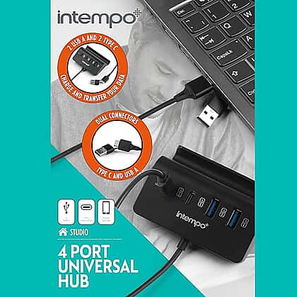 The Intempo 4-Port Hub with Type-C and USB-A connectors is the ultimate accessory for seamless connectivity. Designed to convert one USB port into four, it allows you to effortlessly connect phones, laptops, cameras, and other USB devices. Perfect for home or office use, this multi-functional hub also doubles as a convenient phone holder, keeping your workspace organised. The included Type-C and USB-A adaptor ensures compatibility with a wide range of devices, making it an essential tech companion. Whether for charging or data transfer, this compact and lightweight hub delivers efficiency and ease of use.
