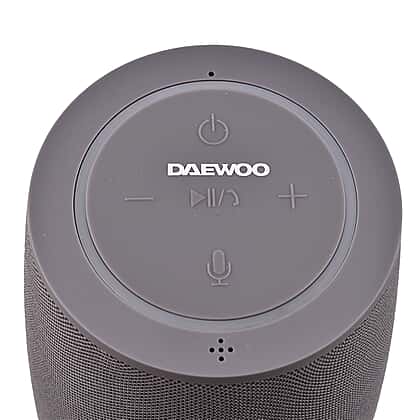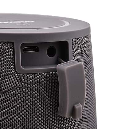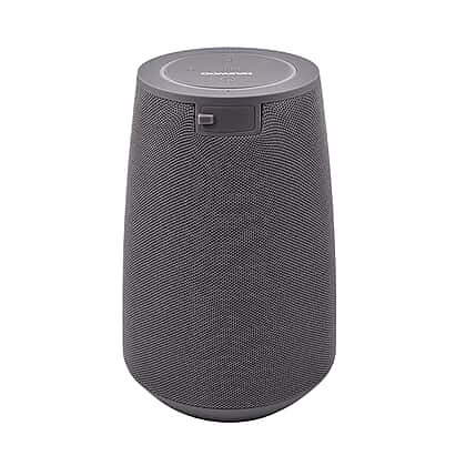 - The grey smart speaker is a sleek, fabric-covered portable Bluetooth speaker