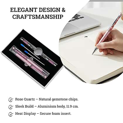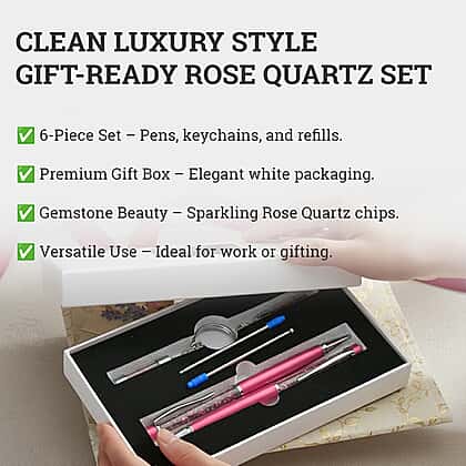 LIVMORE Rose Quarts Gemstone Pen Set with 2 Keychains & 2 Refills - Pink