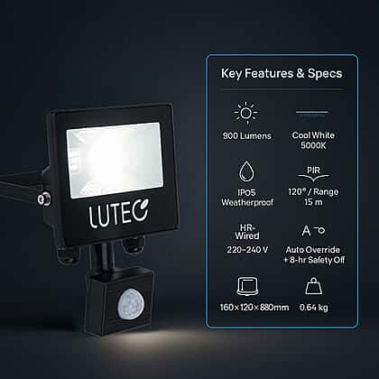 Brighten and secure your outdoor spaces with the TEC10 PIR Integrated LED Floodlight. Delivering 900 lumens of cool white (5000K) illumination, this slim, modern floodlight is equipped with an integrated PIR motion sensor, detecting movement up to 15 metres. Tailor its functionality with adjustable range, time of day settings, and activation duration. An automatic override mode allows constant lighting, while the safety auto-off feature ensures the light switches off after 8 hours if left on. Built with a durable, heavy-duty aluminium frame, it is weather-resistant (IP65 rated) and includes loop-in/loop-out connectors for a seamless installation of multiple units.