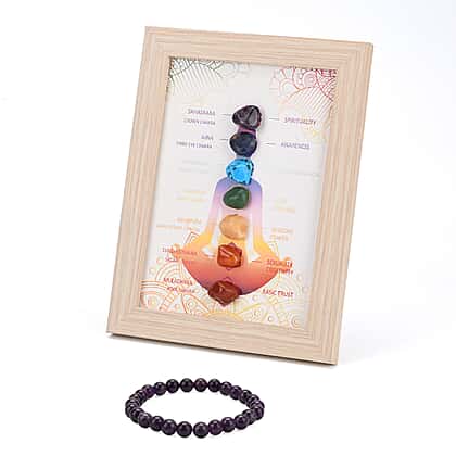 Multi-Gemstone 7 Chakra Healing Crystal Gift Set- Photo Case & Amethyst Beads Stretchable Bracelet (7.8-8 inch)