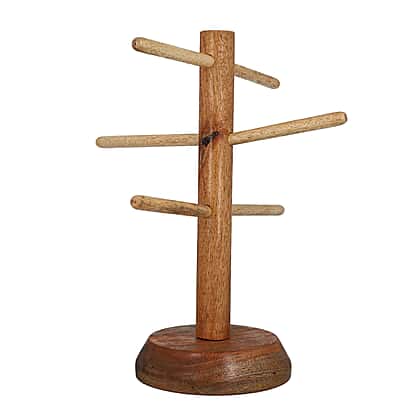 Multipurpose wooden holder; Features multi-level 6 hooks to hang various items. It Can hold up to 6 coffee or tea mug and is also usable as jewellery holder to organise bracelets, rings, necklaces, watches, and other small jewelry items. Upward tilted hooks hold items securely and come with a firm base that provides stability and anti-slip support. Space-saving design does not take up much floor space, and it looks elegant and subtle in appearance. Made of ethically procured natural wood, which is an Eco-friendly and durable choice.