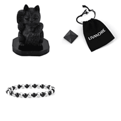 Natural Shungite Maneki Neko Lucky Cat Figurine 920.00 Ct, Natural Shungite Pyramid Presented In a Drawstring Velvet Pouch 213.00 Ct, Natural Shungite, Hematite Bracelet (Stretchable) 80 Ct