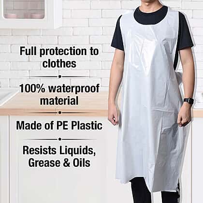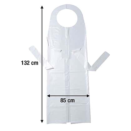 - Measured in the size of size of 85 x 132 cm, the aprons are designed from a sturdy PE Plastic material and are 100% waterproof, assuring you the guarantee of a mess free experience