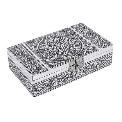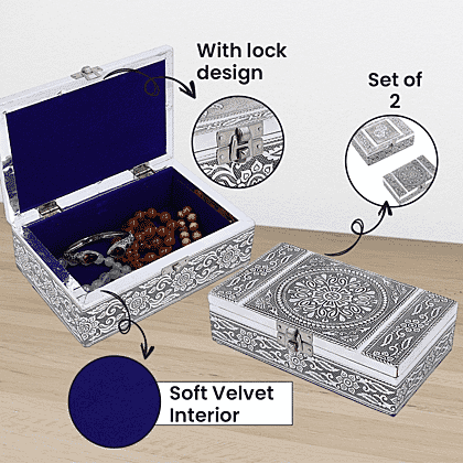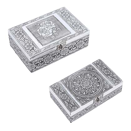 This unique rose and flower motifs set of two aluminium storage boxes is handcrafted by skilled artisans. The two nested boxes are designed so that one can fit into the other. The aluminium lids are embossed with unique prints, respectively. The oxidised finish accents the floral theme of the boxes and lends them an antique look. You can store jewellery, rings and cufflinks in these boxes.