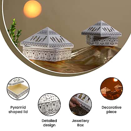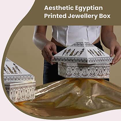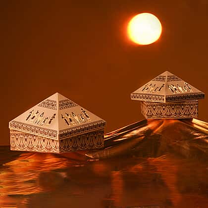 These pyramid-shaped boxes' beautiful look and spacious storage will keep your essentials safe and stylish. Made with eco-friendly handmade paper, this box set will create beautiful décor on your wardrobe. The hand-block printed design creates a charming look, and the Egyptian god's plan adds a beautiful symbolic message. This set has two boxes with different sizes, giving you an open-hand to stock your essentials.