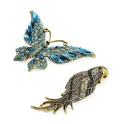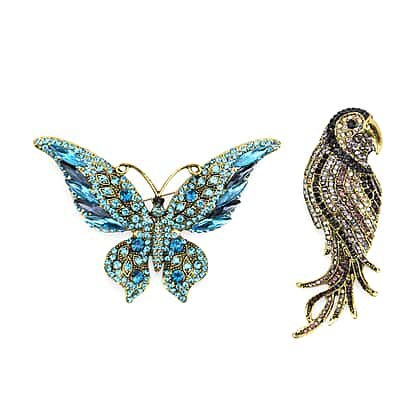 Set of 2 Parrot & Butterfly Diamond Brooches - Multi Colour