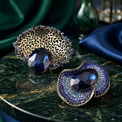 Introduce a refined pop of colour to your ensemble with this set of vintage-inspired brooches, designed to capture attention through rich blue tones and detailed craftsmanship. The deep blue stones contrast beautifully against the textured gold-tone setting, creating a striking visual effect. Each piece features a layered, sculpted design that adds dimension and depth, while the faceted stones enhance light reflection for a subtle yet noticeable shimmer. The intricate borders and fluid shapes give these brooches a distinctive character, making them suitable for both contemporary and classic styling. Perfect for adding a statement accent to blazers, coats, or dresses, this set offers a versatile way to elevate your look with a polished finish.