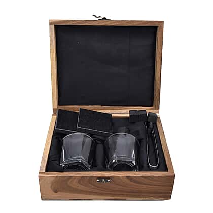 Set Of 2 Whiskey Glasses, Coasters, Chilling Stones & Pair Of Tongs in Wooden Gift Box