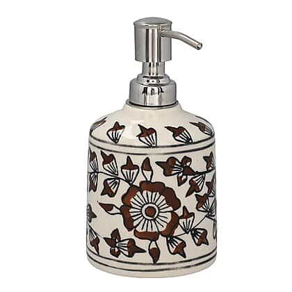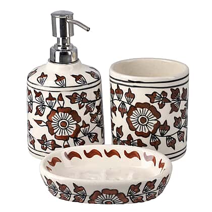 Make your bathroom space clutter free and organised with this set of three ceramic bathroom accessories, which includes a liquid soap dispenser, soap dish and toothbrush holder. These sets give you enough space to store other items and will elevate your bathroom look. The liquid soap dispenser has a metal squeezer to dispense the liquid. This set is made from ceramic material featuring floral prints on the items giving it a royal and traditional touch.