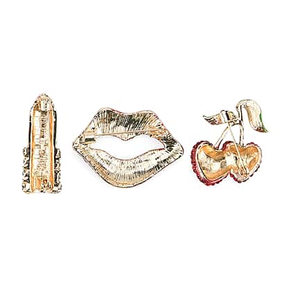 Set of 3 Diamond Enamelled Brooches Lipstick, Cherries & Lips - Multi Colour