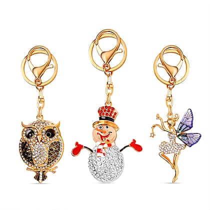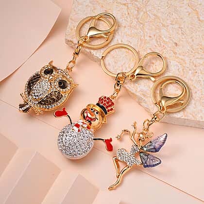 Set of 3 Sparkling Crystal Keychains With Different Designs (Snowman, Fairy, and Owl) - Multi